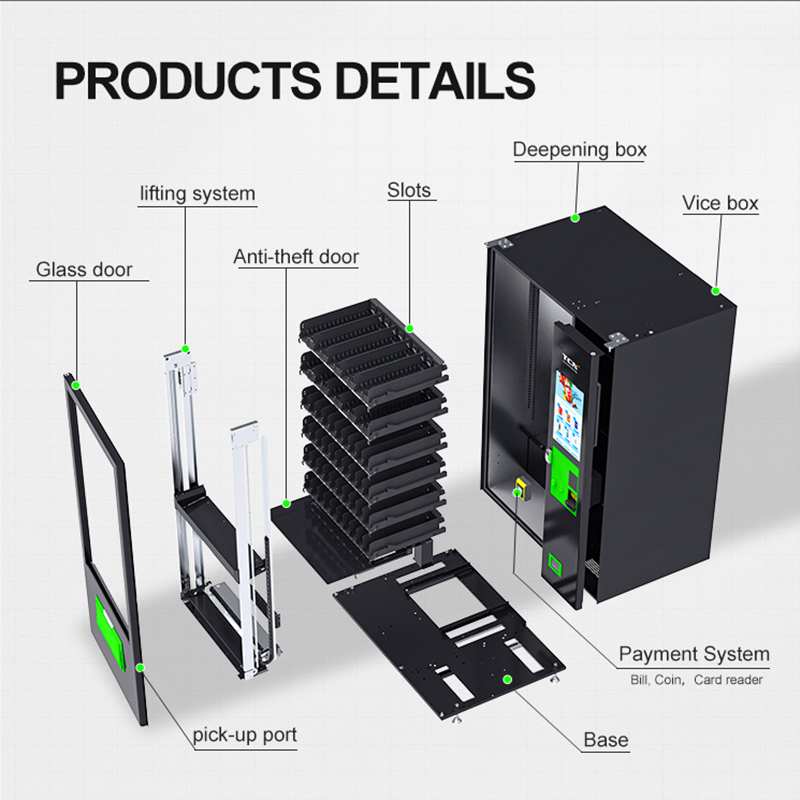La máquina expendedora de gran capacidad TCN, equipada con un sistema de elevador avanzado, satisface las necesidades de venta del 99 % de los productos, lo que la convierte en una opción muy rentable en el mercado. Su diseño espacioso puede acomodar una amplia gama de productos, incluidas bebidas, refrigerios y artículos de uso diario, con ranuras ajustables para adaptarse de manera flexible a diferentes artículos. El sistema de elevador garantiza que los artículos frágiles se puedan recuperar fácilmente sin riesgo de caídas o daños, lo que mejora la experiencia del usuario.