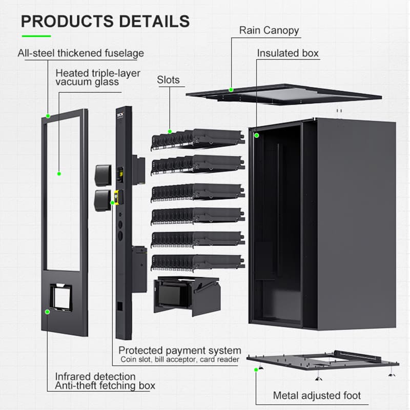 1.Gabinete con recubrimiento de polvo de alta resistencia con material totalmente aislado, unidad expendedora de bajo consumo energético.