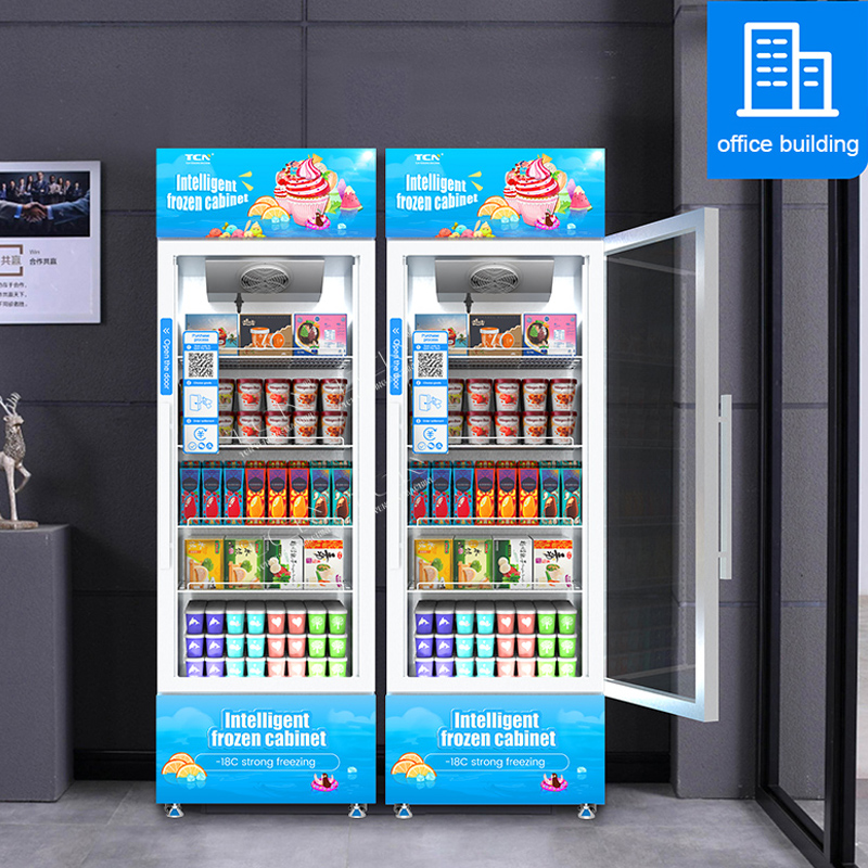 Congelador inteligente de autoservicio TCN, identificación dinámica inteligente AI, admite la venta de todo tipo de productos, adopta un potente compresor de refrigeración, reposición y carga convenientes, admite la personalización de la mayoría de los métodos de pago,