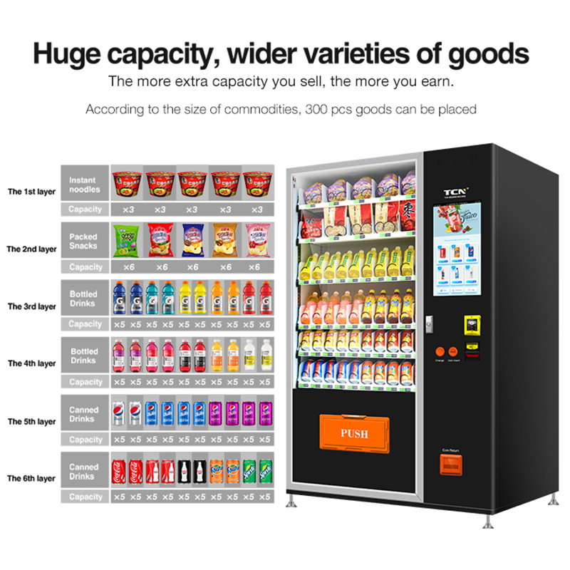 Sélection de produits diversifiée : une variété de boissons et de collations réfrigérées peuvent être stockées dans le distributeur automatique, et une machine peut être utilisée à des fins multiples pour répondre aux besoins diversifiés des consommateurs.Système de réfrigération intelligent : utilisation d'une technologie de réfrigération avancée pour garantir que les boissons et les aliments restent frais et savoureux, adaptés à une utilisation dans diverses occasions.Conception de grande capacité : peut accueillir une variété de produits, réduit le besoin de réapprovisionnement fréquent, améliore l'efficacité opérationnelle et convient aux écoles, immeubles de bureaux, centres commerciaux et autres lieux.Interface conviviale : la conception de l'écran tactile et les multiples méthodes de paiement (telles que les espèces, les cartes bancaires, le paiement par code QR, etc.) permettent aux utilisateurs de finaliser facilement leurs achats rapidement.Système de gestion intelligent : la surveillance des données en temps réel aide les opérateurs à comprendre facilement les ventes, l'état des stocks et d'autres informations pour améliorer l'efficacité de la gestion.