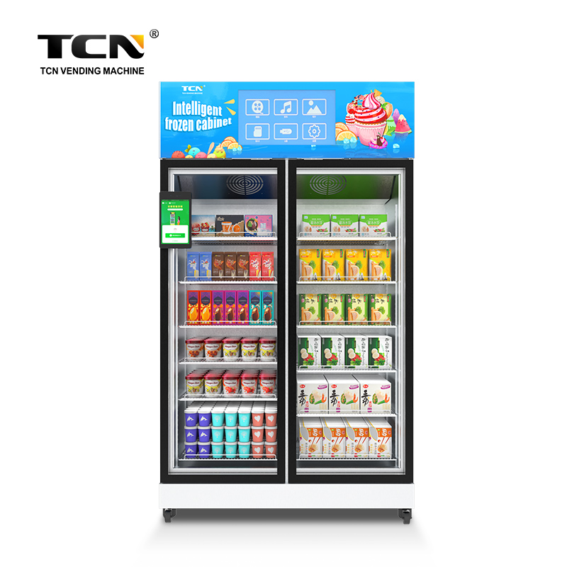 TCN sjálfsafgreiðslu snjallfrystir, AI greindur kraftmikill auðkenning, styður sölu á alls kyns varningi, samþykkir öfluga kæliþjöppu, þægilega áfyllingu og hleðslu, styður aðlögun flestra greiðslumáta.