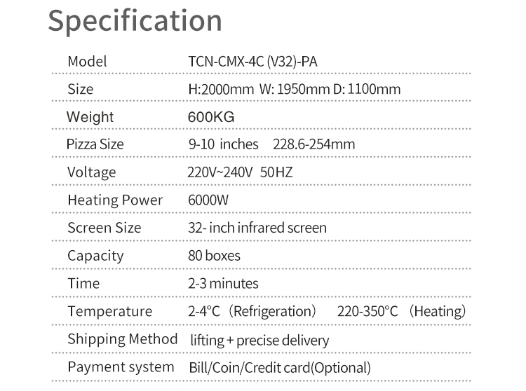 TCN Pizza Vending Machine, the ideal solution for pizza lovers, no need to wait, no queues. Every bite is guaranteed to be delicious and convenient, whether it's for work, school or a late-night snack, our pizza vending machines are at your service 24/7!