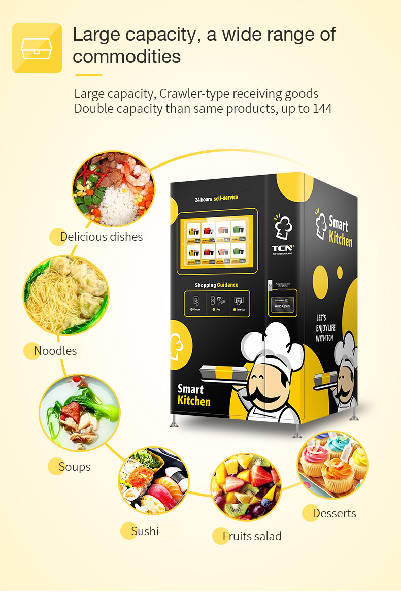 Ka lijo e le mokokotlo, melemo ea inthanete ea lintho, tlhahlobo e kholo ea data, theknoloji le theknoloji ea tlhahisoleseling, mochini o rekisang lijo tse chesang oa TCN o kene lefats'eng le bohlale la mabenkele a sa lebelloang. E ke ke ea hlokomela feela tlhokomelo le taolo e hole, empa hape e boloka litšenyehelo tsa basebetsi le matsete a lichelete, e eketsa melemo le ho ntlafatsa ts'ebetso ea ts'ebetso.