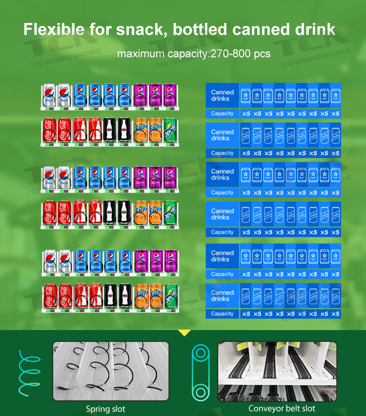 13.Flexible layout for snack,fresh food,cans and bottles.