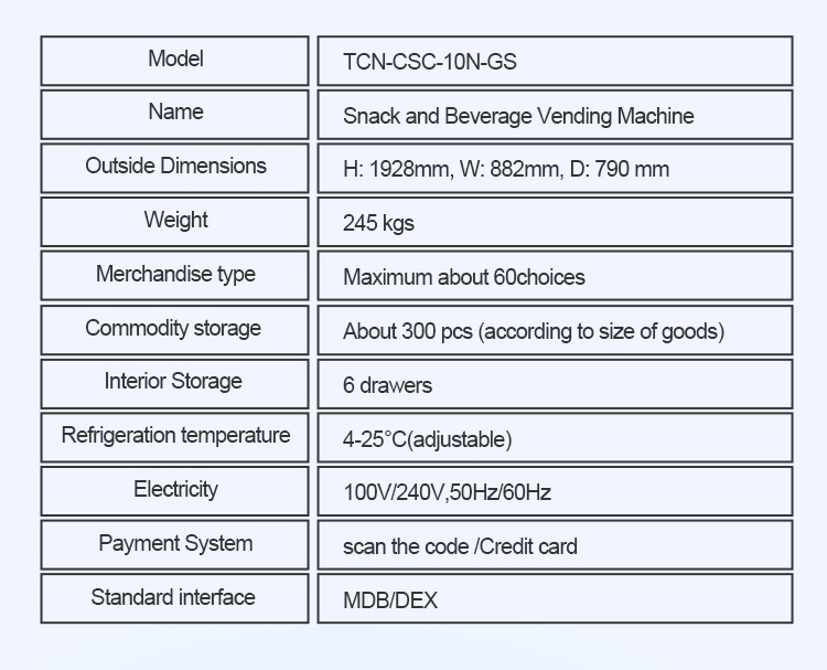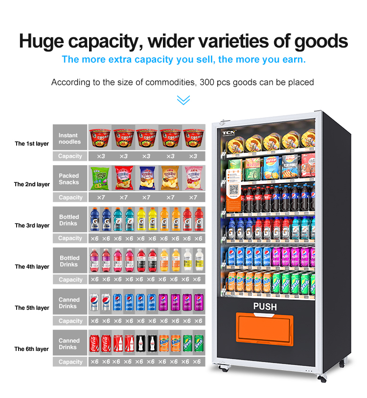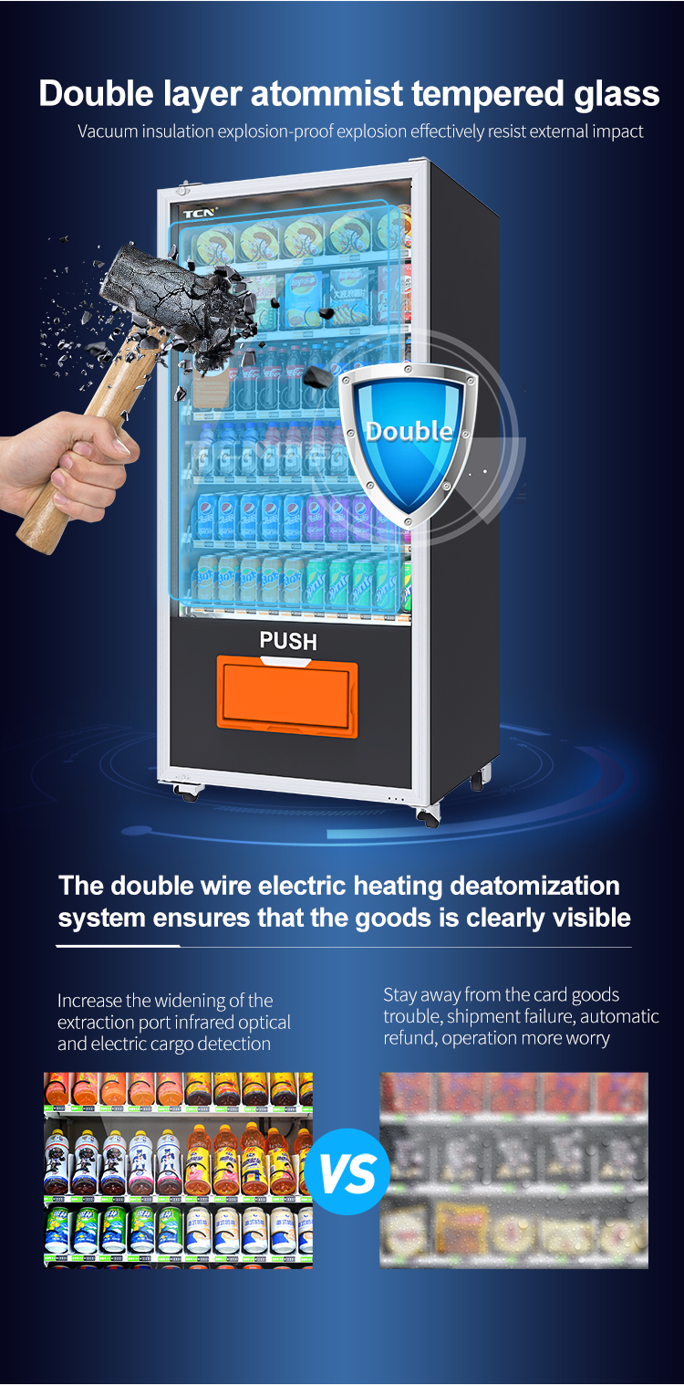 Diverse product selection: A variety of refrigerated beverages and snacks can be stored in the vending machine, and one machine can be used for multiple purposes to meet diversified consumer needs.Intelligent refrigeration system: Using advanced refrigeration technology to ensure that drinks and food remain fresh and taste, suitable for use in a variety of occasions.Large capacity design: Accommodates a variety of goods, reduces the need for frequent replenishment, improves operational efficiency, and is suitable for schools, office buildings, shopping malls and other places.User-friendly interface: Touch screen design and multiple payment methods (such as cash, bank cards, QR code payment, etc.) make it easy for users to complete purchases quickly.Intelligent management system: Real-time data monitoring helps operators easily understand sales, inventory status and other information to improve management efficiency.