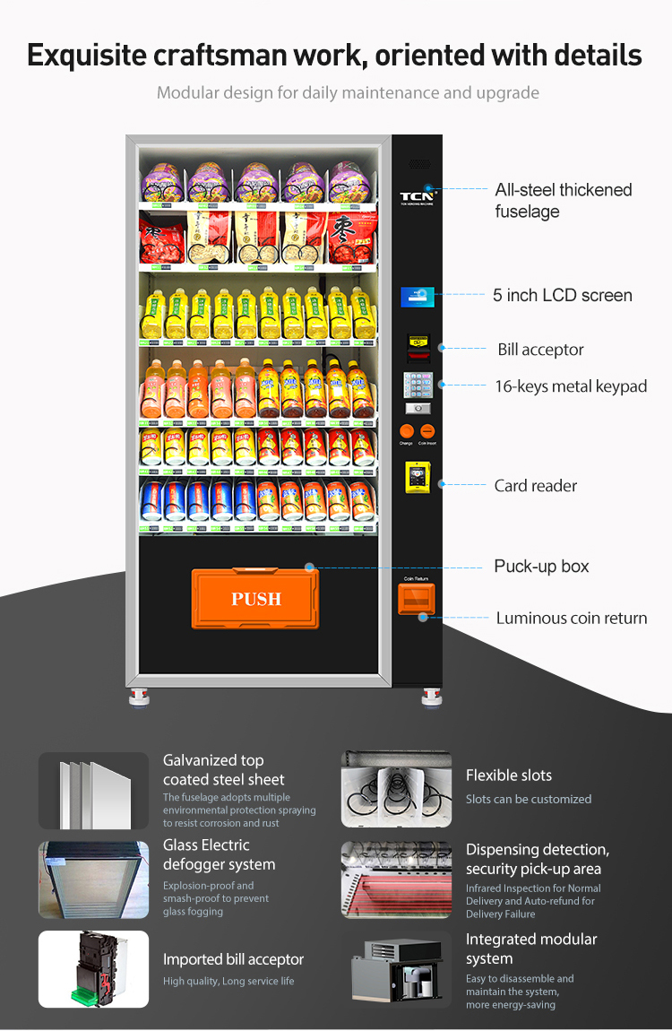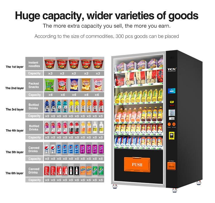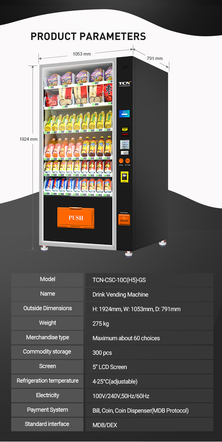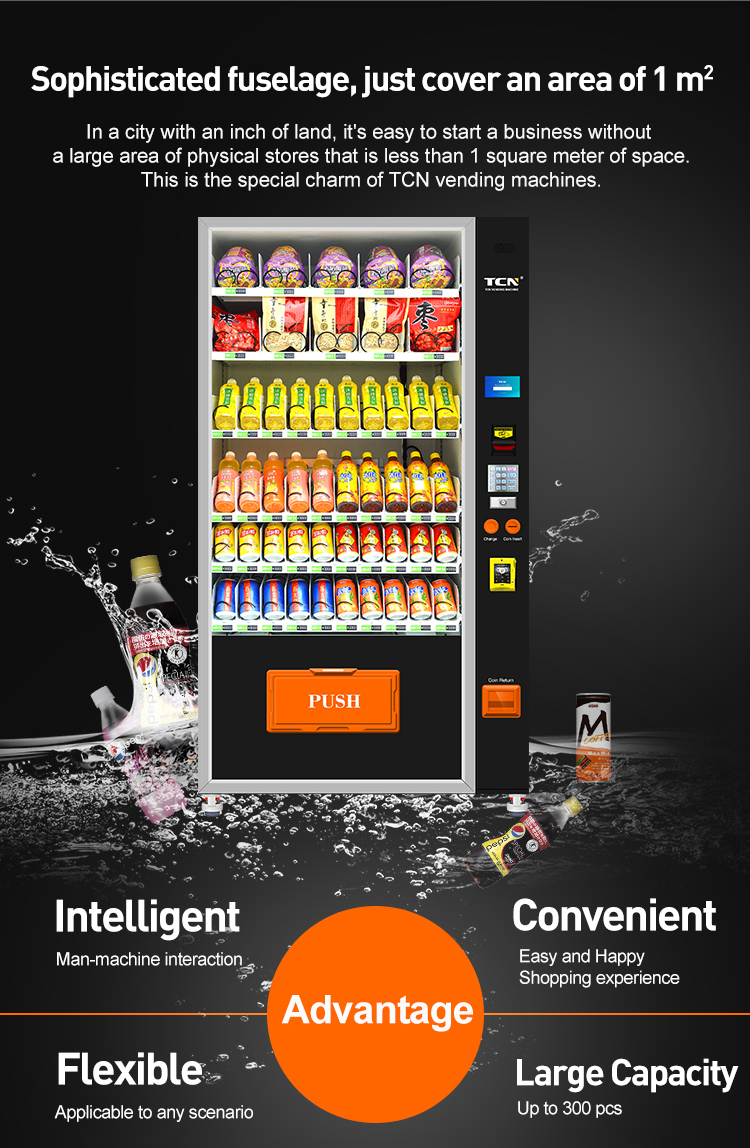 Diverse product selection: A variety of refrigerated beverages and snacks can be stored in the vending machine, and one machine can be used for multiple purposes to meet diversified consumer needs.Intelligent refrigeration system: Using advanced refrigeration technology to ensure that drinks and food remain fresh and taste, suitable for use in a variety of occasions.Large capacity design: Accommodates a variety of goods, reduces the need for frequent replenishment, improves operational efficiency, and is suitable for schools, office buildings, shopping malls and other places.User-friendly interface: Touch screen design and multiple payment methods (such as cash, bank cards, QR code payment, etc.) make it easy for users to complete purchases quickly.Intelligent management system: Real-time data monitoring helps operators easily understand sales, inventory status and other information to improve management efficiency.
